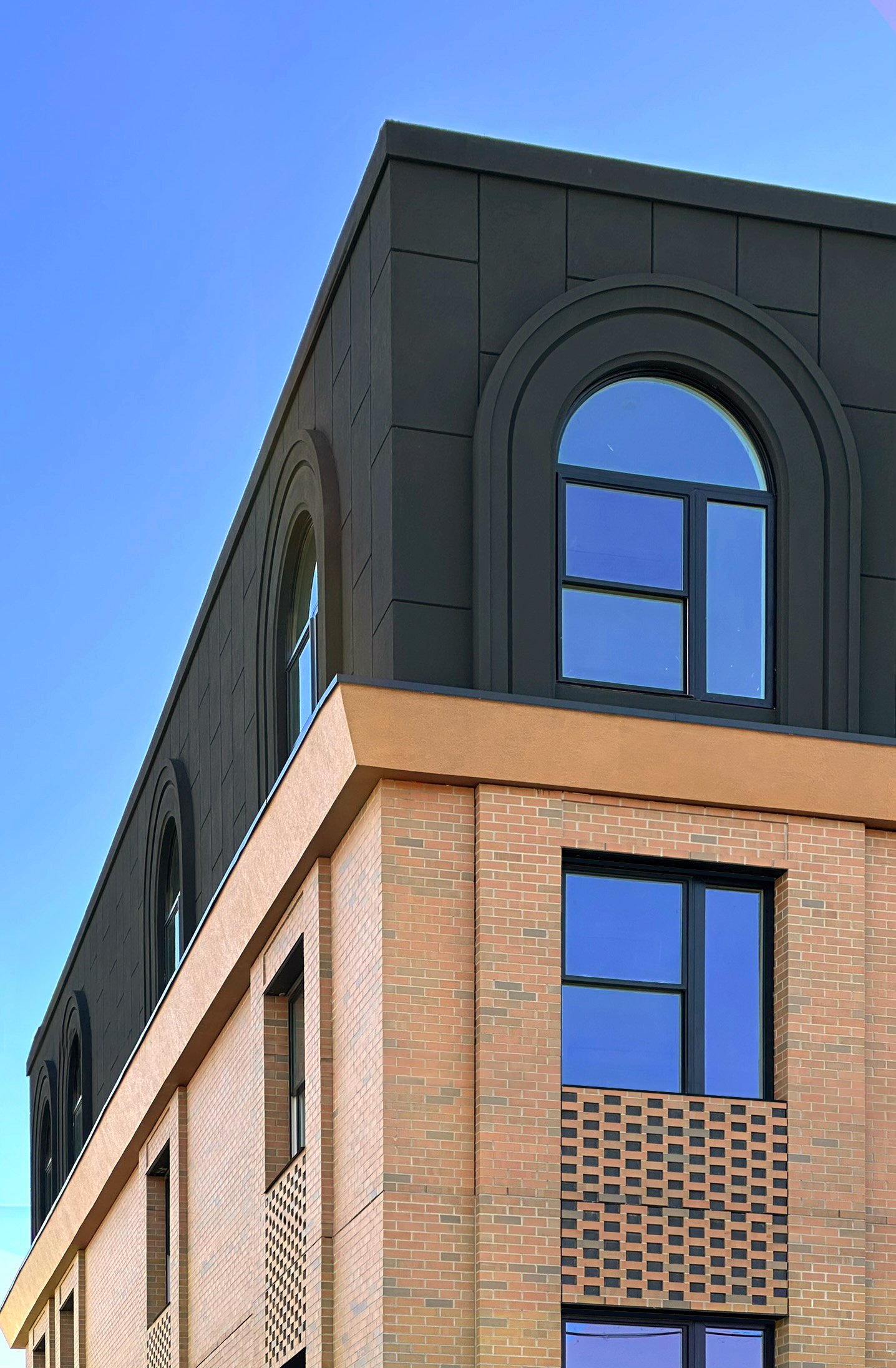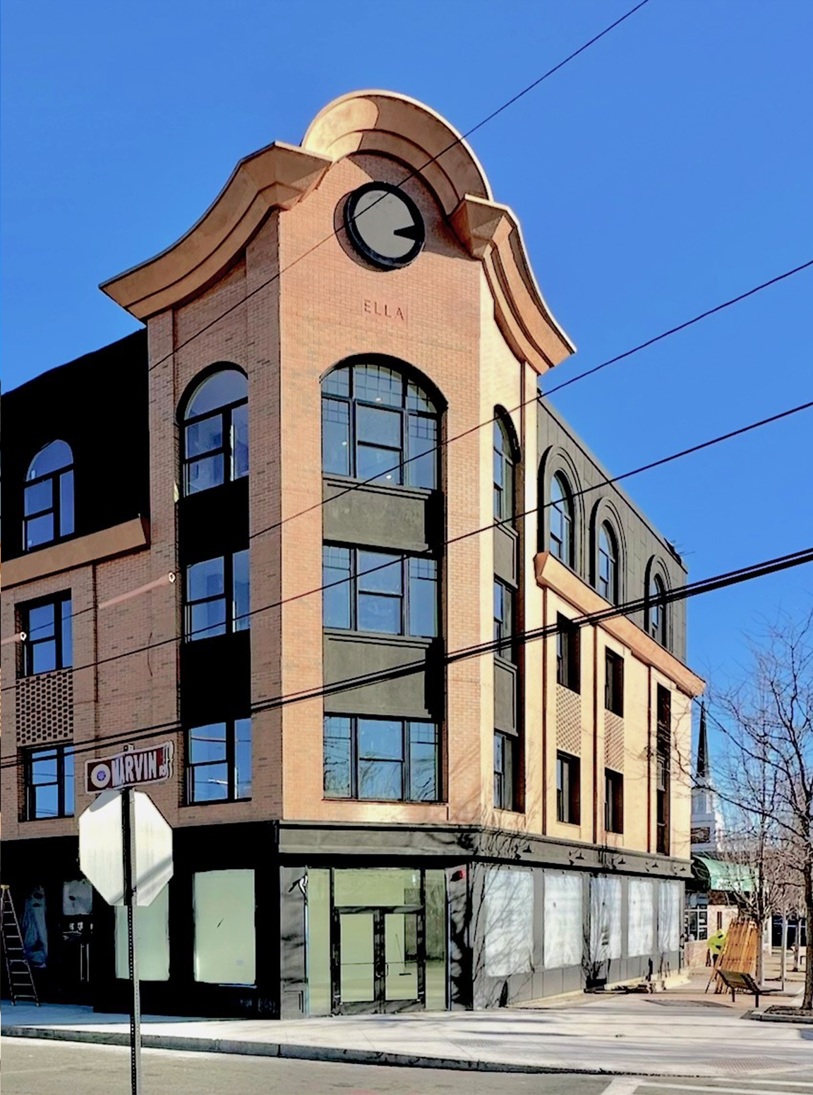 The project began in 2020 on a site with an existing corner market and surface parking lot adjacent to the Melrose Highlands MBTA Commuter Rail stop. As an anchor to a small commercial corridor built on Franklin Street, the corner is nestled amongst a larger residential area. To preserve the area’s casual food market while maximizing density along transit lines, the design incorporated three residential stories above a revamped market space and covered ground floor parking. The intent was to solidify Melrose’s character by drawing inspiration from the historical brick buildings of downtown Main Street, whose intricate details make full use of the three-dimensionality of brick. This resulted in a stacked massing of independent materials to delineate public from private. For the Ella’s facade, the play of shifted brick creates continuous vertical elements in the pilasters and window bands to offset the horizontality of the brick and compliment the grand gesture of the corner clock face—a distinguishable landmark for those arriving in Melrose by commuter rail or via Franklin Street.